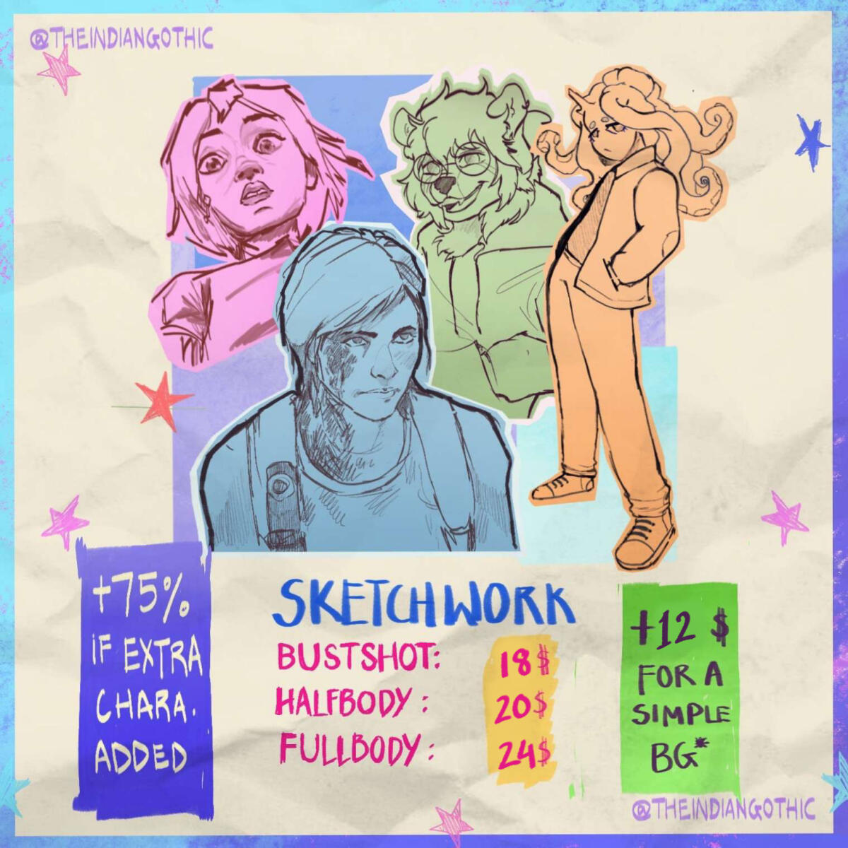- Payment can done via Paypal.- Do not claim my artwork as your own, regardless of payment.- 50% of the payment must be received upfront. Refunds will not be issued past the sketch phase.- If used for commercial purposes, it must be stated before the commission process begins. Additional charges will be added for commercial use.- I have the autonomy to refuse a commission request for any reason.- Usage of my work for AI tools is strictly prohibited.- If published online, credits to be attributed to @theindiangothic (instagram) within the caption.- No changes can be made to the design past it's lineart stage.- Upon commencement of the artwork, not more than 2 minor changes can be applied-- if a client has any last minute changes, they will be charged accordingly.- No refunds shall be provided.
